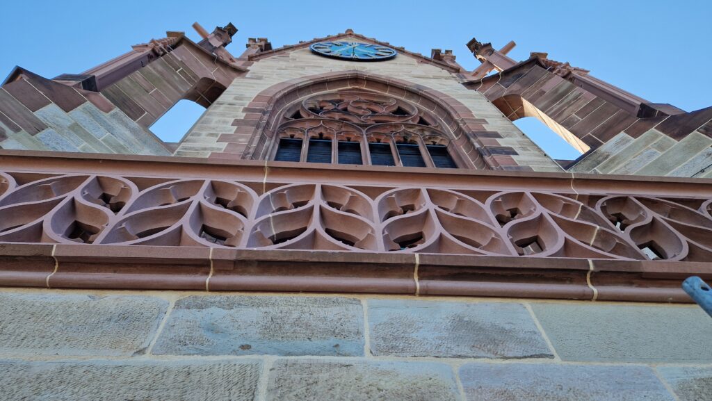 Bei strahlendem Sonnenschein hatte sich der Architekt Herr Fritz für uns auf der Baustelle Zeit genommen, um uns den aktuellen Stand der Bauarbeiten zu erläutern. Derzeit laufen die Fassadenarbeiten unterhalb der Balustrade am Turm weiter. In mühevoller Handarbeit werden alle Fugen ausgebessert. Hohlräume hinter den Steinen mit Mörtel gefüllt und anschließend die Steine wiedereingesetzt. So…