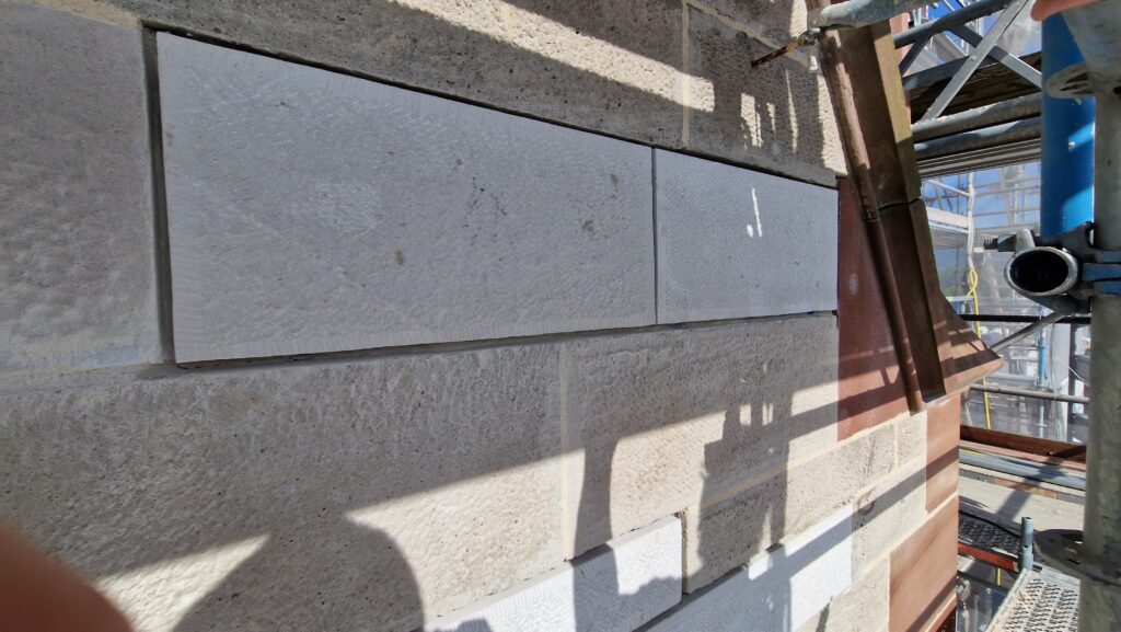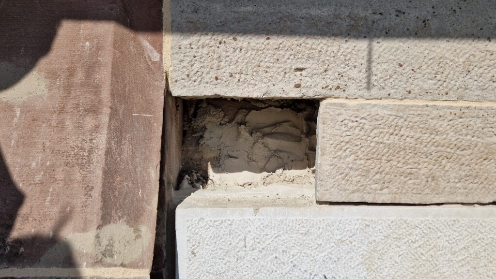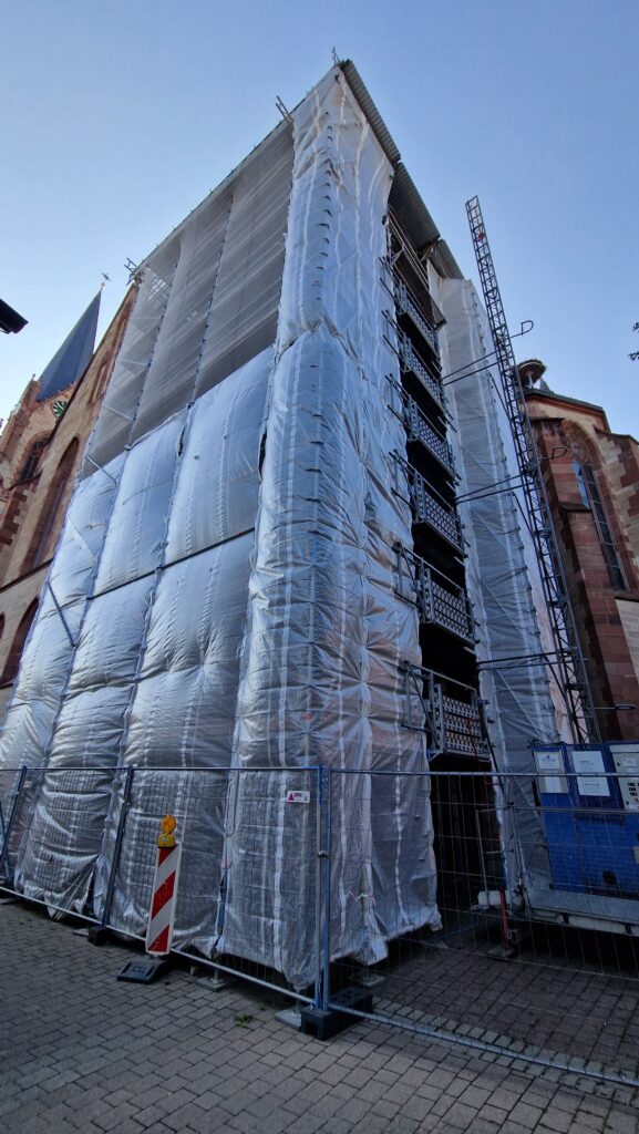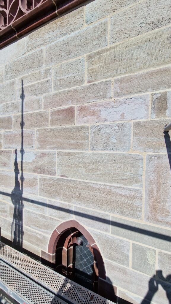 Derzeit laufen die Fassadenarbeiten unterhalb der Balustrade am Turm weiter. In mühevoller Handarbeit werden alle Fugen ausgebessert. Hohlräume hinter den Steinen mit Mörtel gefüllt und anschließend die Steine wiedereingesetzt. So werden die Arbeiten langsam an der Fassade heruntergezogen, sodass auch das Gerüst stückweise zurückgebaut werden kann.