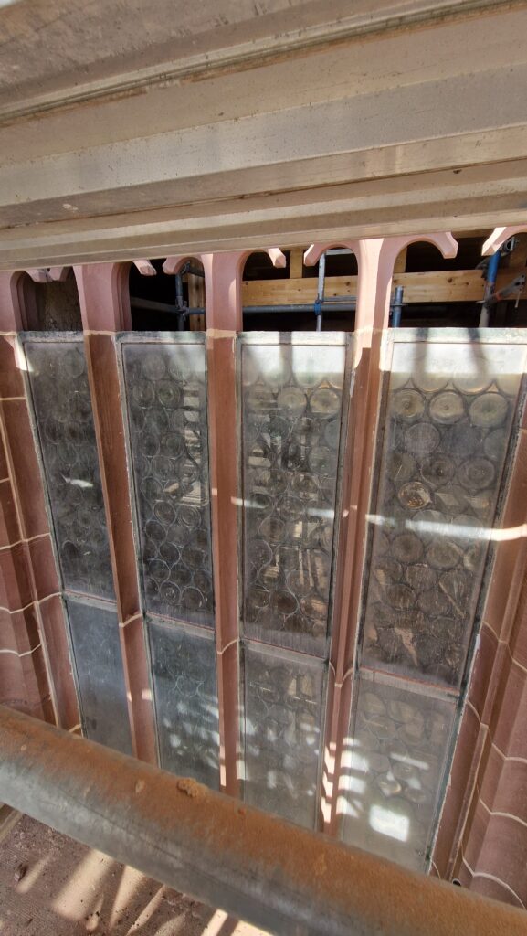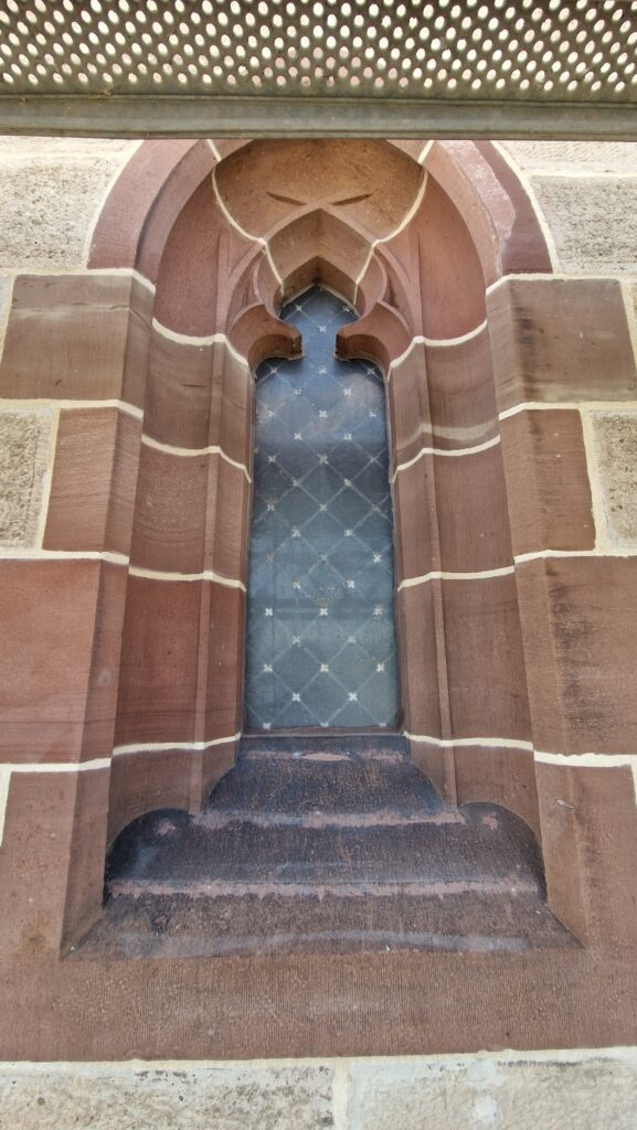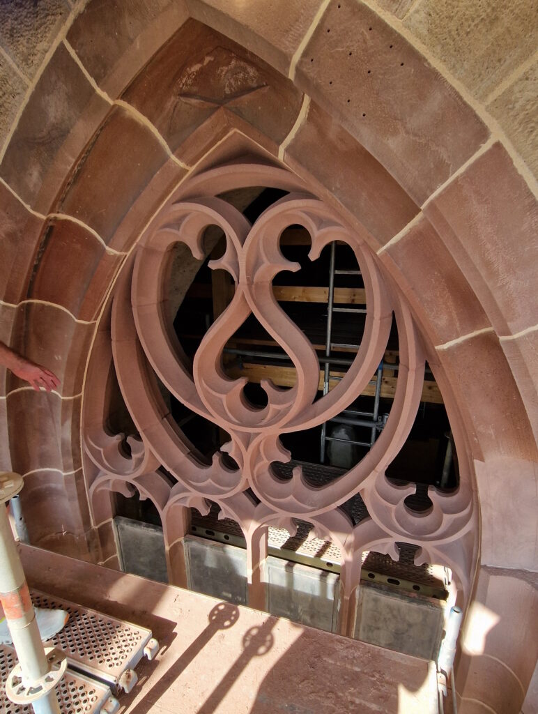 Das Fenster mit Maßwerk über der hinteren rechten Eingangstür war nahezu völlig instabil. Dieses wurde vollkommen neu produziert und strahlt nun in neuem Glanz. Für diese schwierige Anfertigung wurden die einzelnen Teile im Steinmetzbetrieb in Kuppenheim gefertigt und dann vor Ort zusammengefügt. Aktuell wird vom Glaser das alte Originalglas wieder angesetzt.