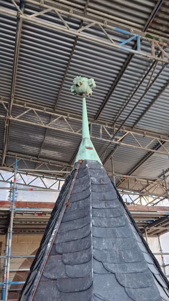 Das Dach des kleinen Turmes über der Sakristei ist bereits neu eingedeckt und am Seitendach sind die Balken ausgebessert. Momentan ruht dort die Baustelle, aufgrund des Naturschutzes für die Störche. Diese hatten sich dort niedergelassen und man muss hier abwarten, bis die Störche in Richtung Süden ziehen. Erst dann dürfen die Arbeiten am Kamin weitergeführt werden. Mit der Hoffnung auf schnellen Abzug der Störche könnte dort das Gerüst bis Ende des Jahres abgebaut werden.