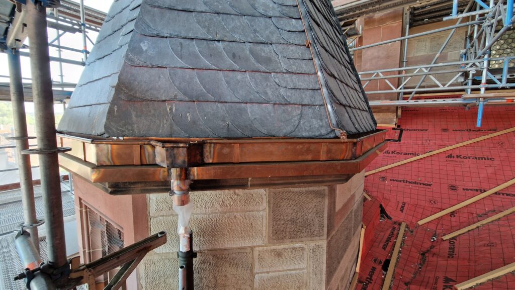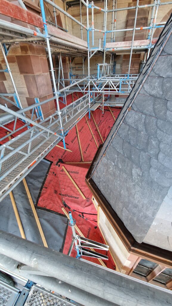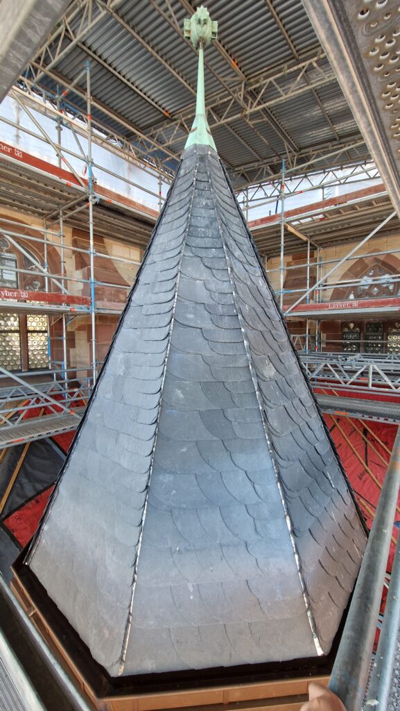 Nach wie vor ist die große Dachfläche ein Problem. Die Schieferdeckung ist in die Jahre gekommen und müsste dringend ersetzt werden. Doch die Finanzierung ist noch nicht komplett sichergestellt für diesen 2. Bauabschnitt. An vielen Stellen sind schon Vorbereitungen vom Blechner getroffen, um die Regenwasserableitung künftig besser zu optimieren. Somit würde auch der Innenraum davon profitieren. Wir hoffen, dass dieses Problem durch die Genehmigungen aus Freiburg gelöst werden kann.